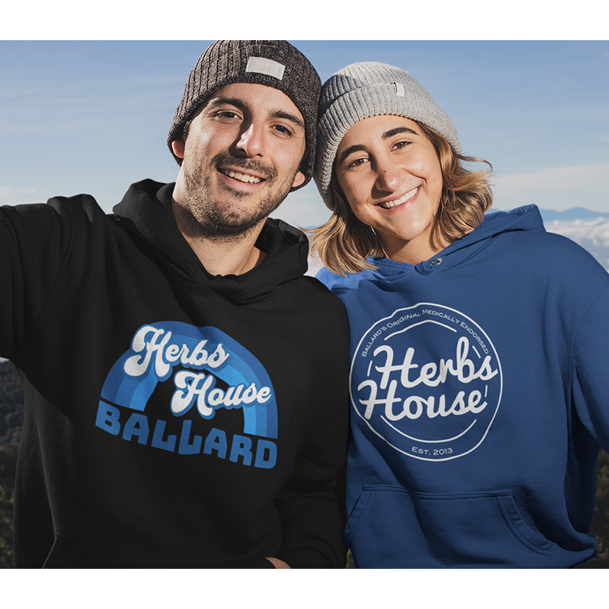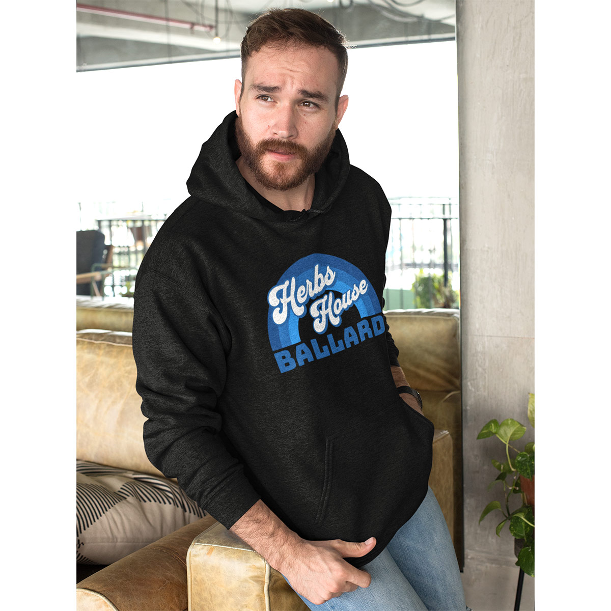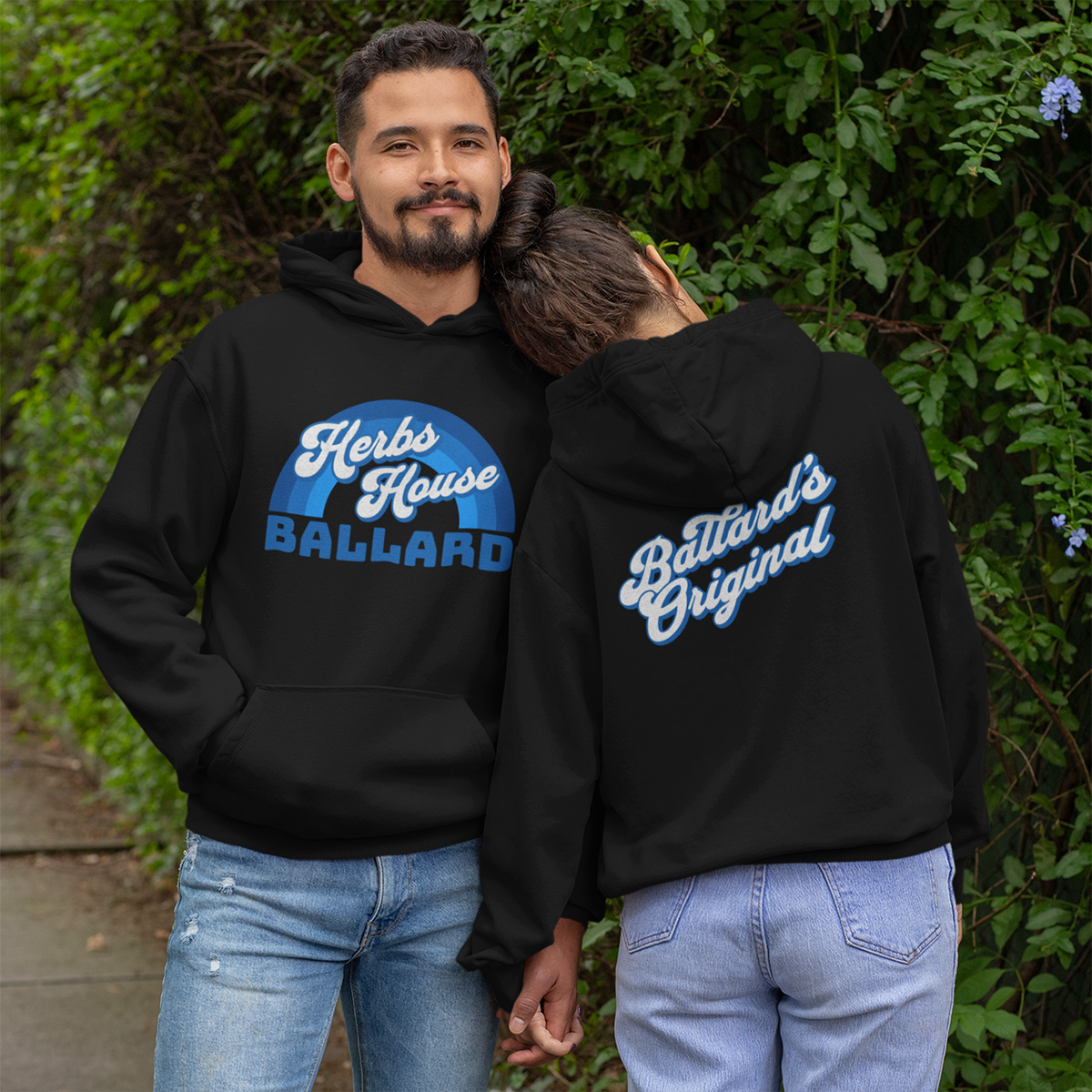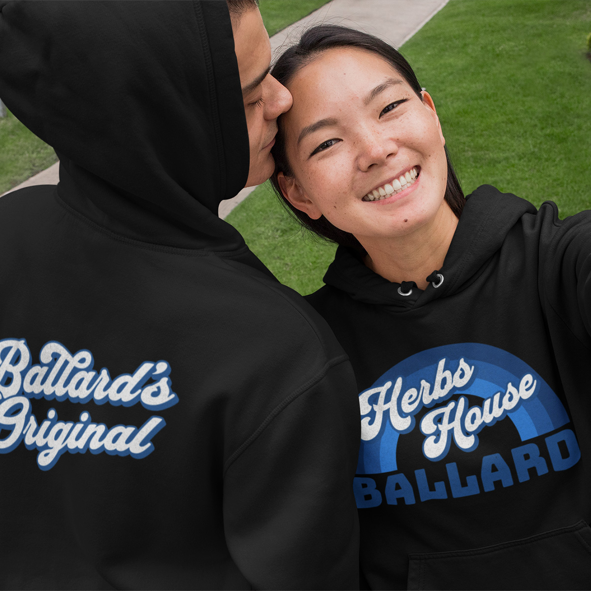 This is the ultimate winter layer for Herbs House fans – full of personality, warmth, and local pride. The blue rainbow logo adds a fun pop of color, while the back print honors Ballard’s roots with a bold expressive script. Whether you’re gifting it or grabbing one for yourself, this hoodie is made for keeping cozy in the PNW weather.